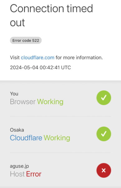 aguse.jp に接続できない不具合が発生【解消済み】 2024 5/04 2024年5月4日 09:35 Kou (KopKouNet) URLをコピーしました! ※現在は解消されています。昨日からaguse.jp に接続できない不具合が発生していました。 速報 この記事が気に入ったら フォローしてね! Follow @kopmagazinejp Follow Me ネットで共有してみよう URLをコピーしました! URLをコピーしました! X(Twitter)で不具合が発生。【解消済み】 コップマガジン総合サイトを開設いたしました。 ライター Kou (KopKouNet) 「コップマガジン」創設者、編集長。 ゲームやガジェットが好物。気になったものをどんどん記事にしていきたい。 この著者の記事一覧へ 関連記事 【速報】 Twitter Japan 株式会社、X Corp. Japan 株式会社へ社名変更へ。 2024年11月23日 14:07 【速報】「どうぶつの森 ポケットキャンプ」オンラインサービスを終了しオフラインサービスに移行へ 2024年8月22日 15:20 【速報】「ファンタジーライフi グルグルの竜と時を盗む少女」発売延期に 2024年8月19日 23:22 全世界でWindowsでブルースクリーンが発生する問題が報告される。原因はクラウドストライクと推定 2024年7月19日 15:50 X(Twitter)で不具合が発生。【解消済み】 2024年4月29日 17:16 コメント コメントする コメントをキャンセルコメント ※コメントは日本語で入力してください。(スパム対策)名前 ※ メール ※ サイト 次回のコメントで使用するためブラウザーに自分の名前、メールアドレス、サイトを保存する。私はロボットではありません。